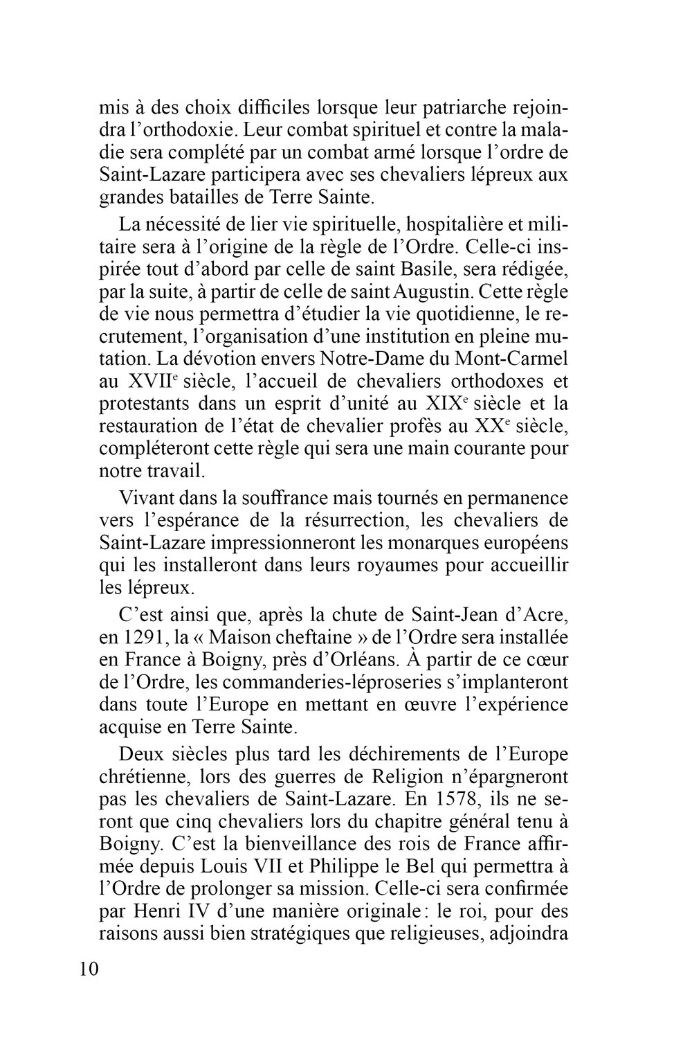 Religieux et hospitalier, l’Ordre devient militaire pour participer à la défense de la Terre sainte. Après la chute de Saint-Jean d’Acre, en 1291, les chevaliers de Saint-Lazare développent des commanderies-léproseries dans l’Europe entière et installent leur siège en France, à Boigny, près d’Orléans. S’inspirant d’une spiritualité basilienne et augustinienne, l’Ordre a perduré au fil des siècles, et accueille, depuis le XIXe siècle, des membres orthodoxes et protestants, prônant l’unité des chrétiens.