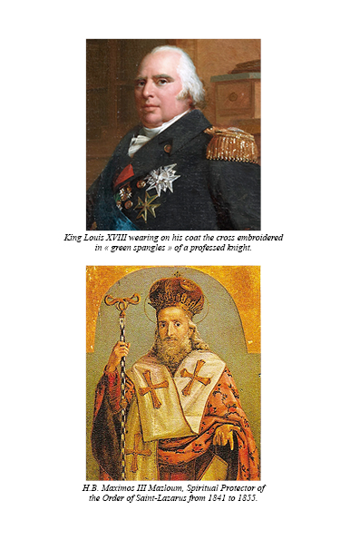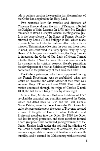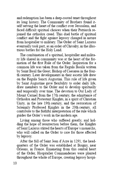 Religious and hospitable, the Order became military in order to participate in the defence of the Holy Land. After the fall of Saint-Jean d’Acre in 1291, the Knights of Saint Lazarus developed leprosariums throughout Europe and established their headquarters in Boigny, near Orléans, France. Inspired by Basilian and Augustinian spirituality, the Order has endured over the centuries and, since the 19th century, has welcomed Orthodox and Protestant members, promoting Christian unity.